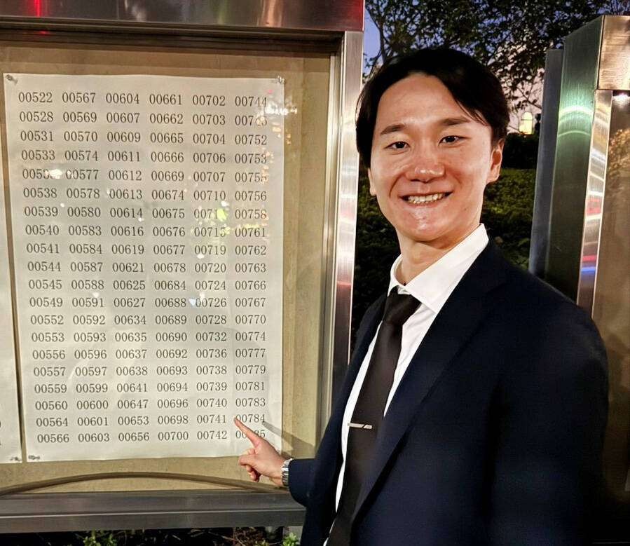 司法試験に合格し、法務省の前で受験番号を笑顔で指さす宮台康平氏(本人提供)