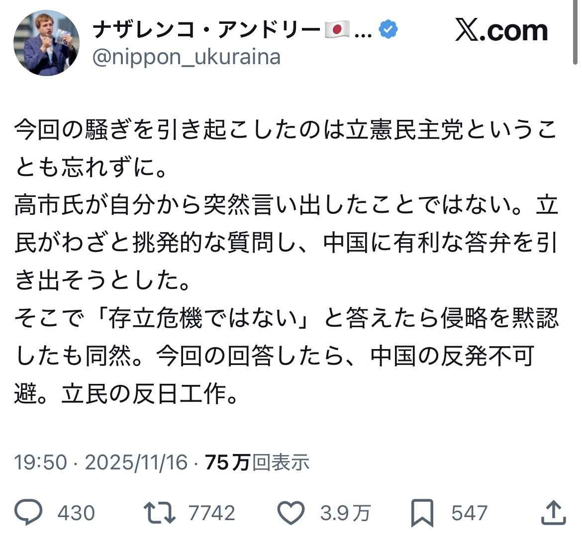 「違うんです中国さん、悪いのは高市総理では無く立憲とかいう日本の野党が・・・」