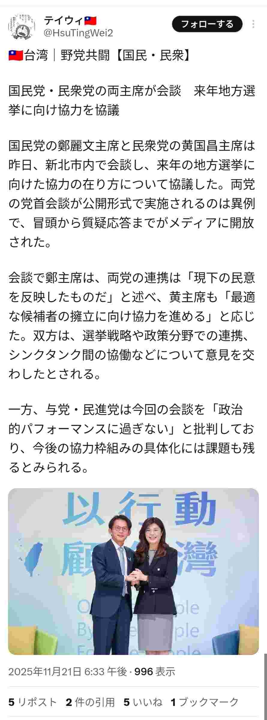 台湾野党、選挙協力へ。高市と共同して台湾有事を煽る独裁与党・民進党に危機