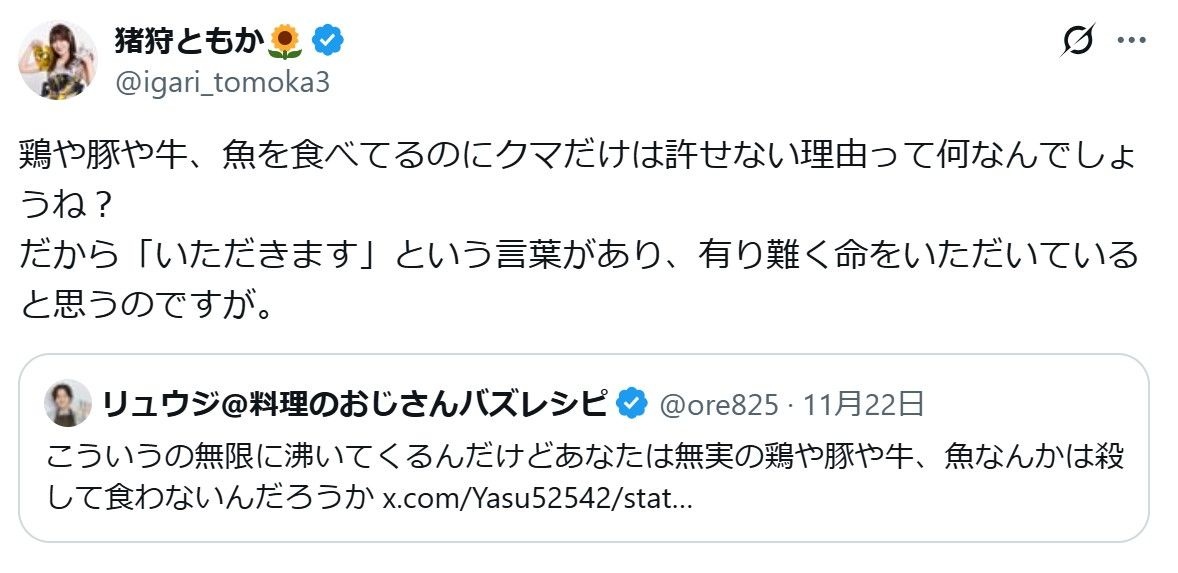 リュウジ氏のポストを引用する形で、猪狩は「鶏や豚や牛、魚を食べてるのにクマだけは許せない理由って何なんでしょうね?」と疑問を投げかけた。「だから『いただきます』という言葉があり、有り難く命をいただいていると思うのですが」と食事をめぐる持論を展開している。