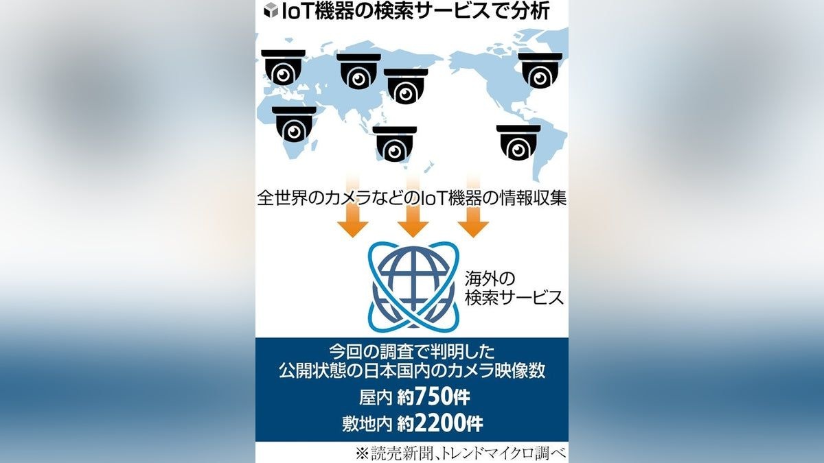 読売新聞とトレンドマイクロは、これまでの調査で、日本国内のカメラ映像などを公開している海外の7サイトを特定。7サイトに公開された日本の屋内・敷地内の映像は10月時点で、保育園や食品工場など計約500件確認された。