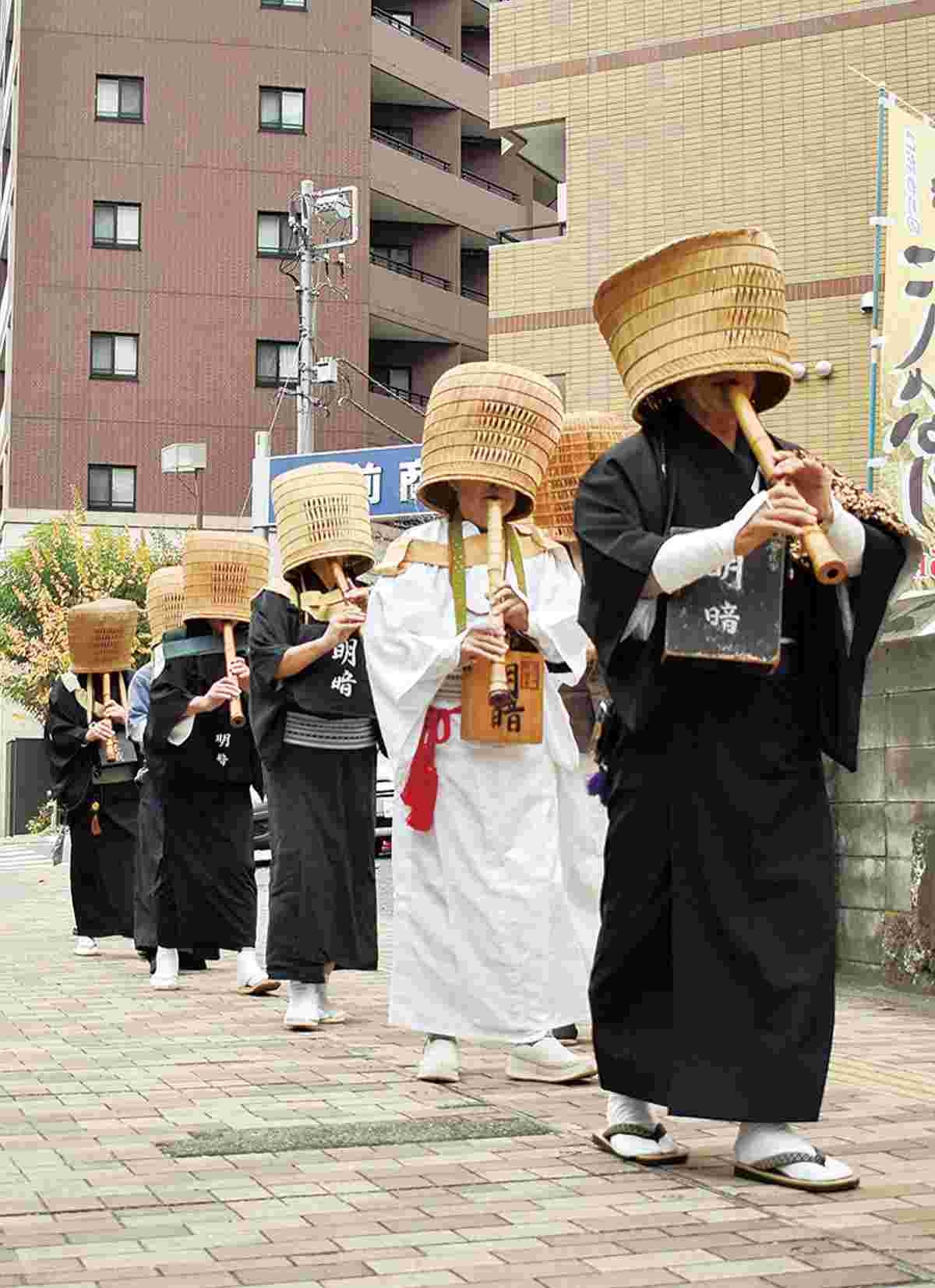 以来、奉賛会では尺八文化を後世に伝えようと本覚寺で定期的に献奏会を行っているほか、5年に一度、虚無僧姿での練り歩きも実施している。5年前はコロナ禍で開催を見送ったため、今回は碑の建立から25周年を記念し、10年ぶりの実施となった。