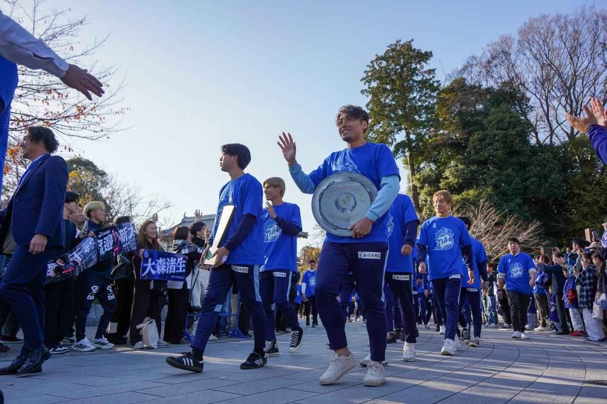 サッカーJ2水戸ホーリーホックが11月30日、水戸市立第二中学校グラウンド(水戸市三の丸)で「2025明治安田J2リーグ優勝報告会」を開いた。