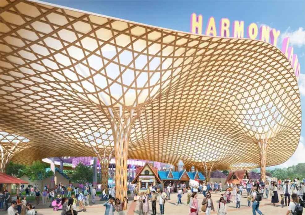 リゾート化は「天空のパーク構想」と名付けた。現在あるハーモニーランド(駐車場などを含む約23ヘクタール)と隣接する山林エリア(約20ヘクタール)を一体的に再整備。ランドエリアを拡大し、全天候型の大屋根を設置する。ロープウエーなどを使い、広大で高低差のある敷地内を誰でも移動しやすい環境を整える。