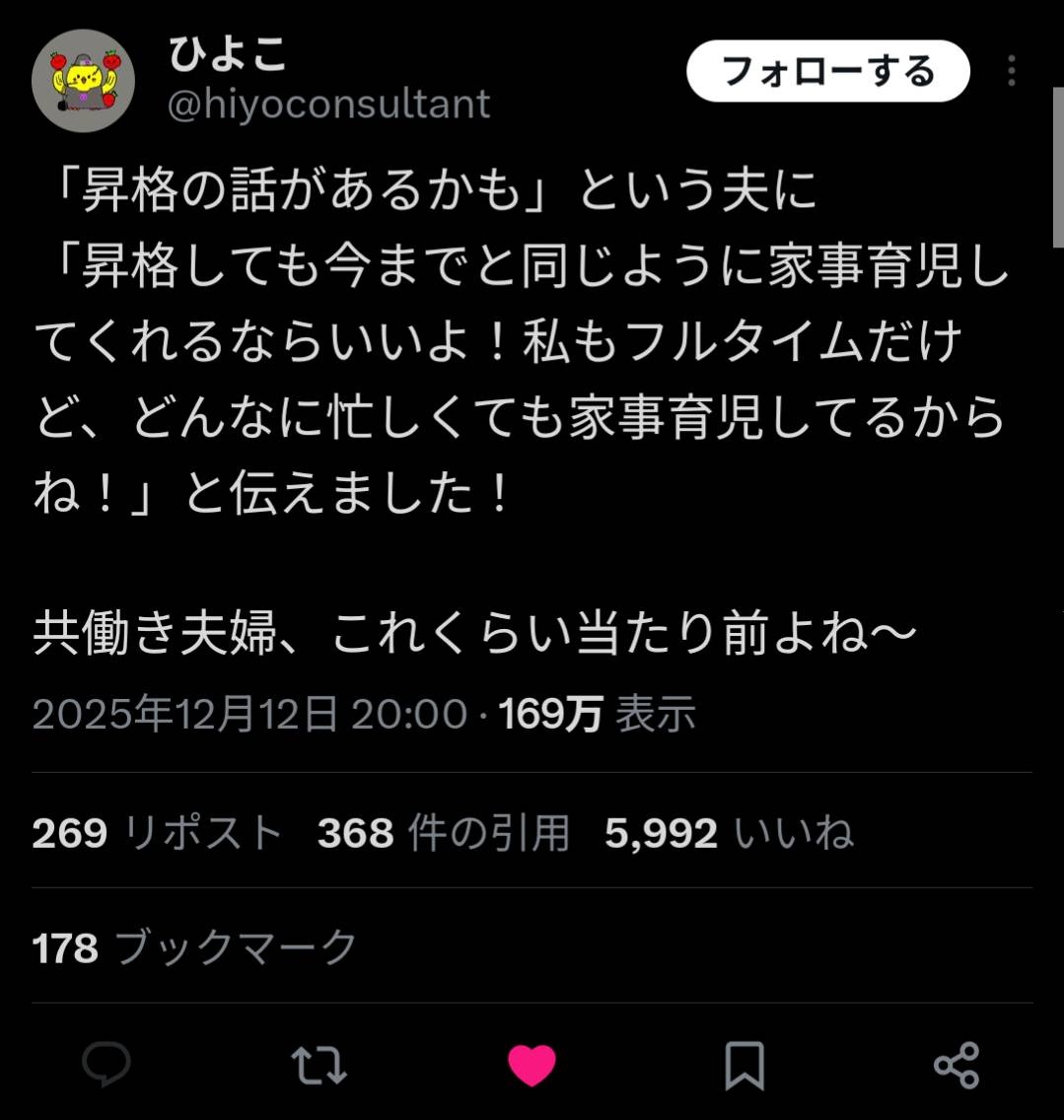 家事は男女同程度にやるべきだとは思うが、昇進の話とかした時に、こんなこと言い出す嫁がいたら、たぶん別れるな
