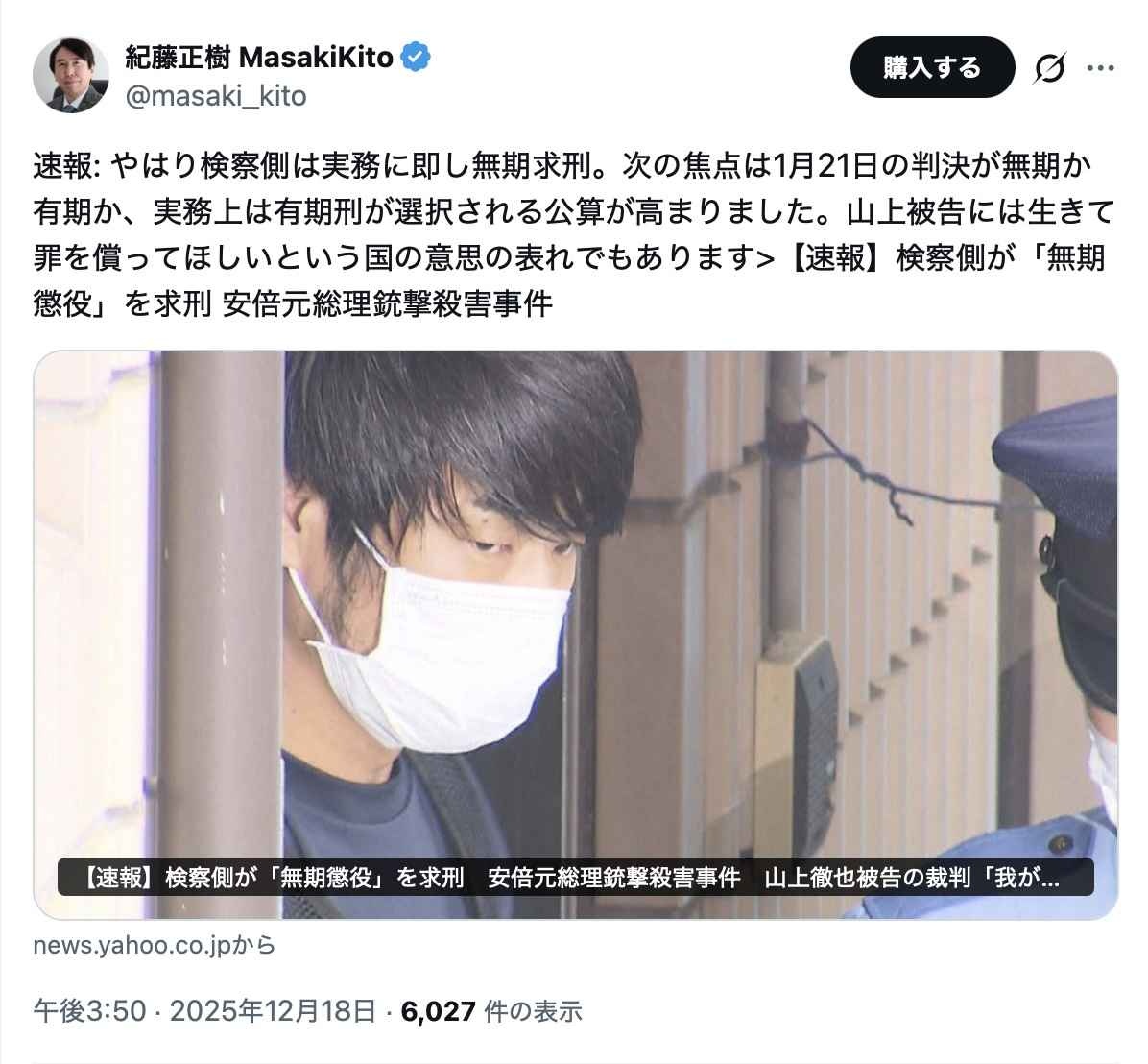 山上の動機が政治的でないのと、安倍晋三には落ち度があったことから有期刑が適当