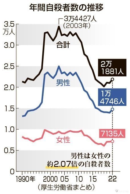 男の自殺率がめちゃくちゃ高いから日本は相当女優遇社会だよな