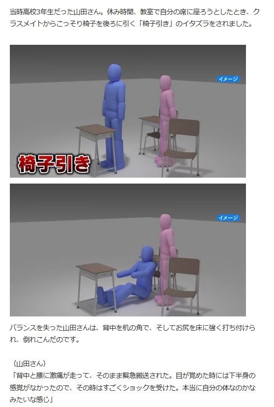 https://newsdig.tbs.co.jp/articles/-/1190258?display=1「クラスの女子生徒が後ろから椅子を引いて、不意にやられたので受け身も取れずに机の角で背中を打って、