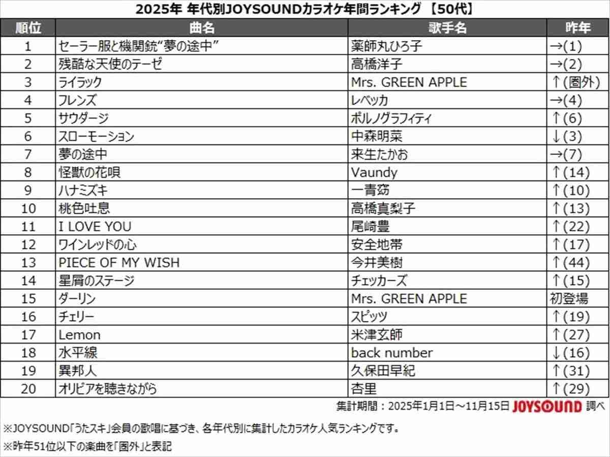 エクシング(名古屋市瑞穂区)が、JOYSOUNDが展開するカラオケ・ソーシャルメディア「うたスキ」の会員の歌唱に基づき、10代から60代の年代別にカラオケの人気曲を集計した「2025年 年代別カラオケ年間ランキング」を紹介しています。