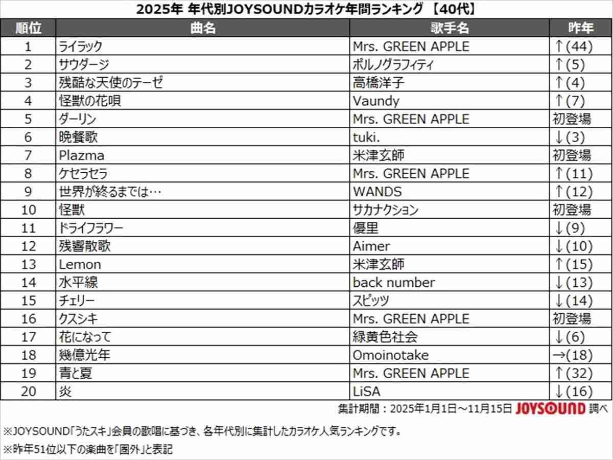 10代の1位は、バンド「ポルノグラフィティ」が2001年に発表したヒット曲「サウダージ」でした。20代、30代、40代の1位はバンド「Mrs. GREEN APPLE」の人気曲「ライラック」という結果でした。