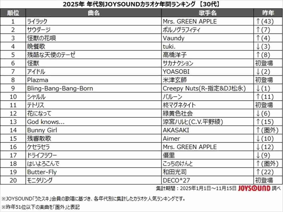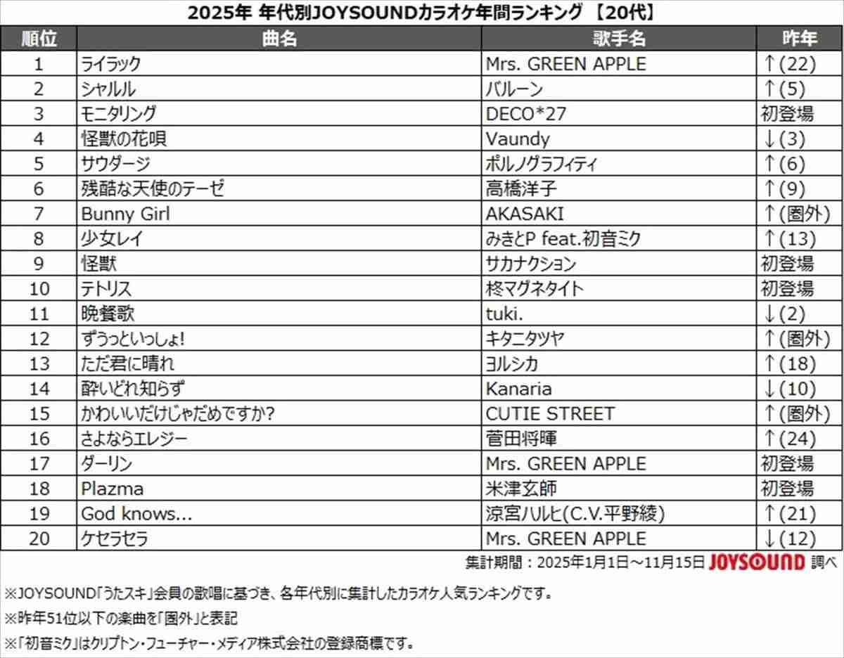計期間は2025年1月1日~11月15日。ランキングは、選曲番号別ではなく、楽曲別として「本人映像」や「アニメカラオケ」などのオリジナルコンテンツも合算して集計。