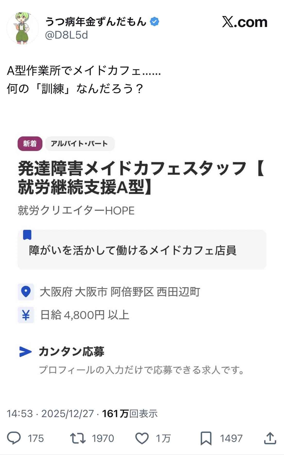 メイドカフェで働いてるやつなんて発達障害どころか知的障がい者ありそうなんだけど