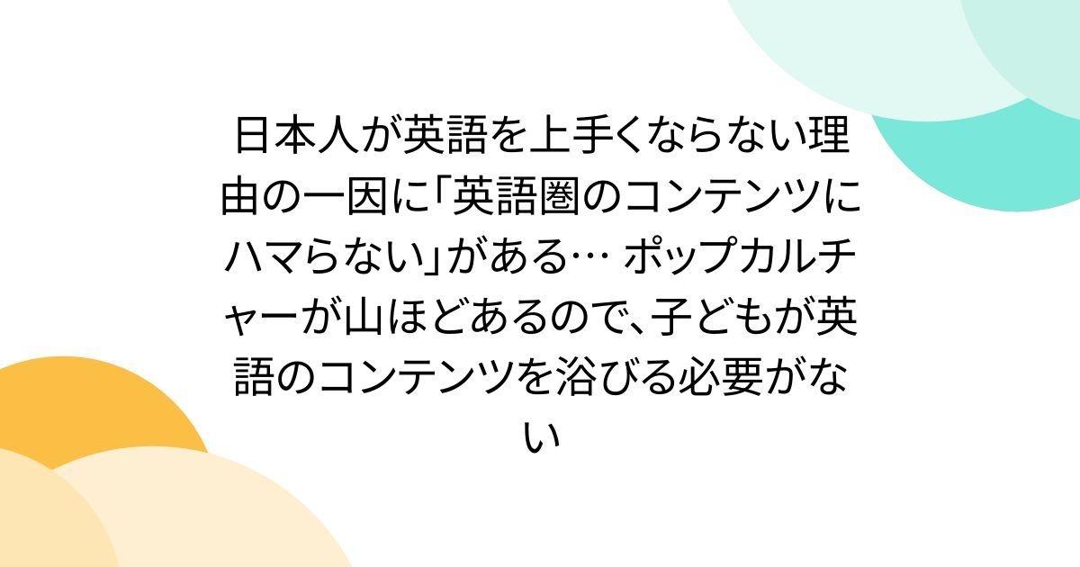 ポップカルチャーが山ほどあるので、子どもが英語のコンテンツを浴びる必要がない 日本人が英語を上手くならない理由の一因に「英語圏のコンテンツにハマらない」がある… ポップカルチャーが山ほどあるので、子どもが英語のコンテンツを浴びる必要がない英語が得意にならない一因は、国内の面白い日本語コンテンツや親が教育的番組を選ぶことにより、子どもが英語圏ポップカルチャーに触れる機会が乏しく、字幕なしで英語作品を楽しむ経験が不足している点だ。配信環境は整っているが、日常的に英語コンテンツを選ぶ意識が必要だ。togetter.com