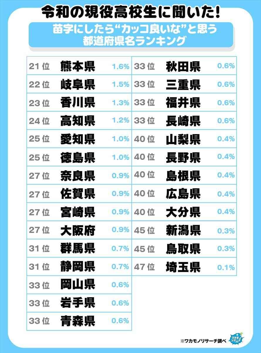 10代・現役高校生を対象としたマーケティング情報サイトを運営するワカモノリサーチ(東京都杉並区)が、アンケート「名字にしたらカッコイイと思う都道府県は?」の結果をランキングで紹介しています。