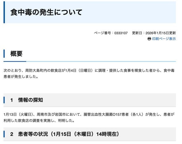 女性自身1月15日、4日に山口県周防大島町の飲食店で料理を食べた7人が食中毒の症状を訴え、3人から腸管出血性大腸菌O157が確認されたことを山口県生活衛生課が発表した。