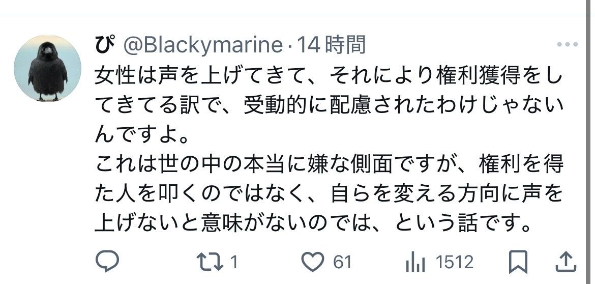 その状態て声を上げてる弱者を自らの性別によって自分は無視しますはどうかと思いますけどね
