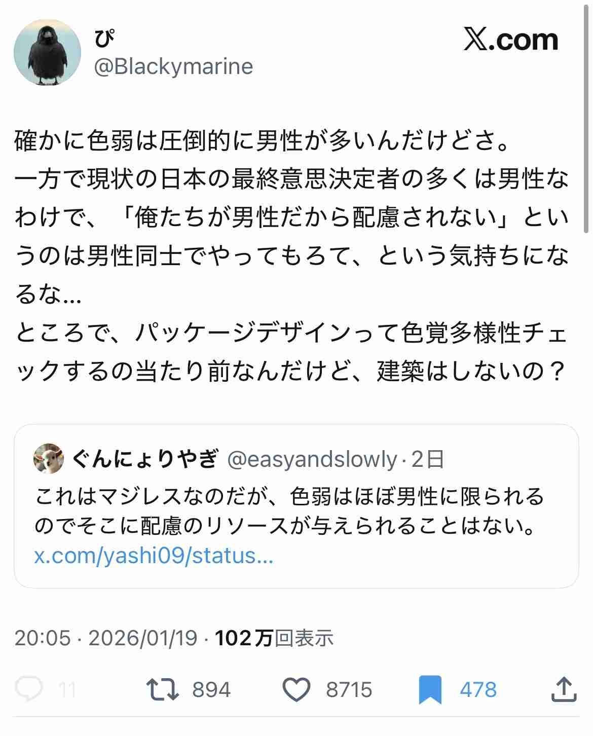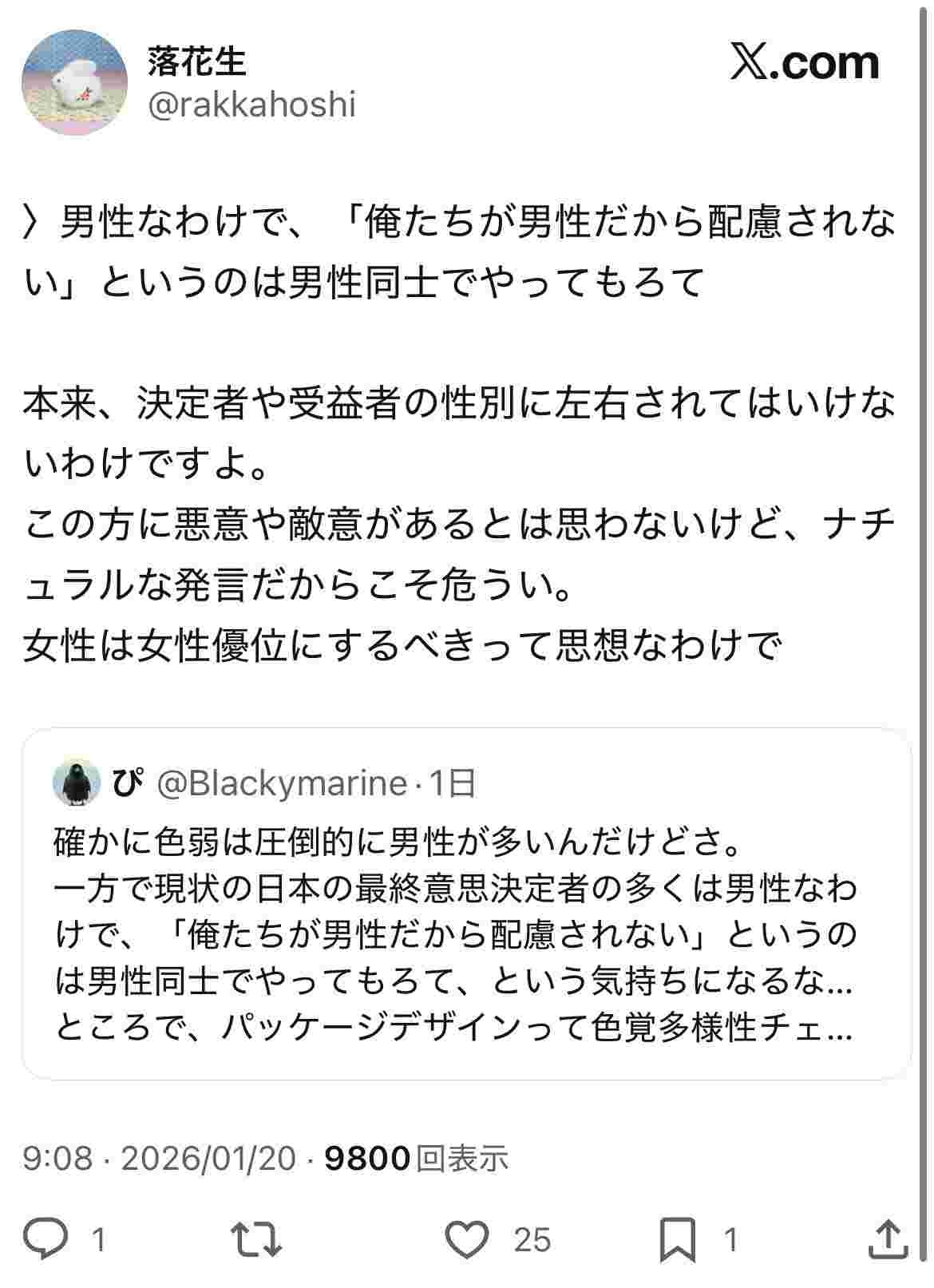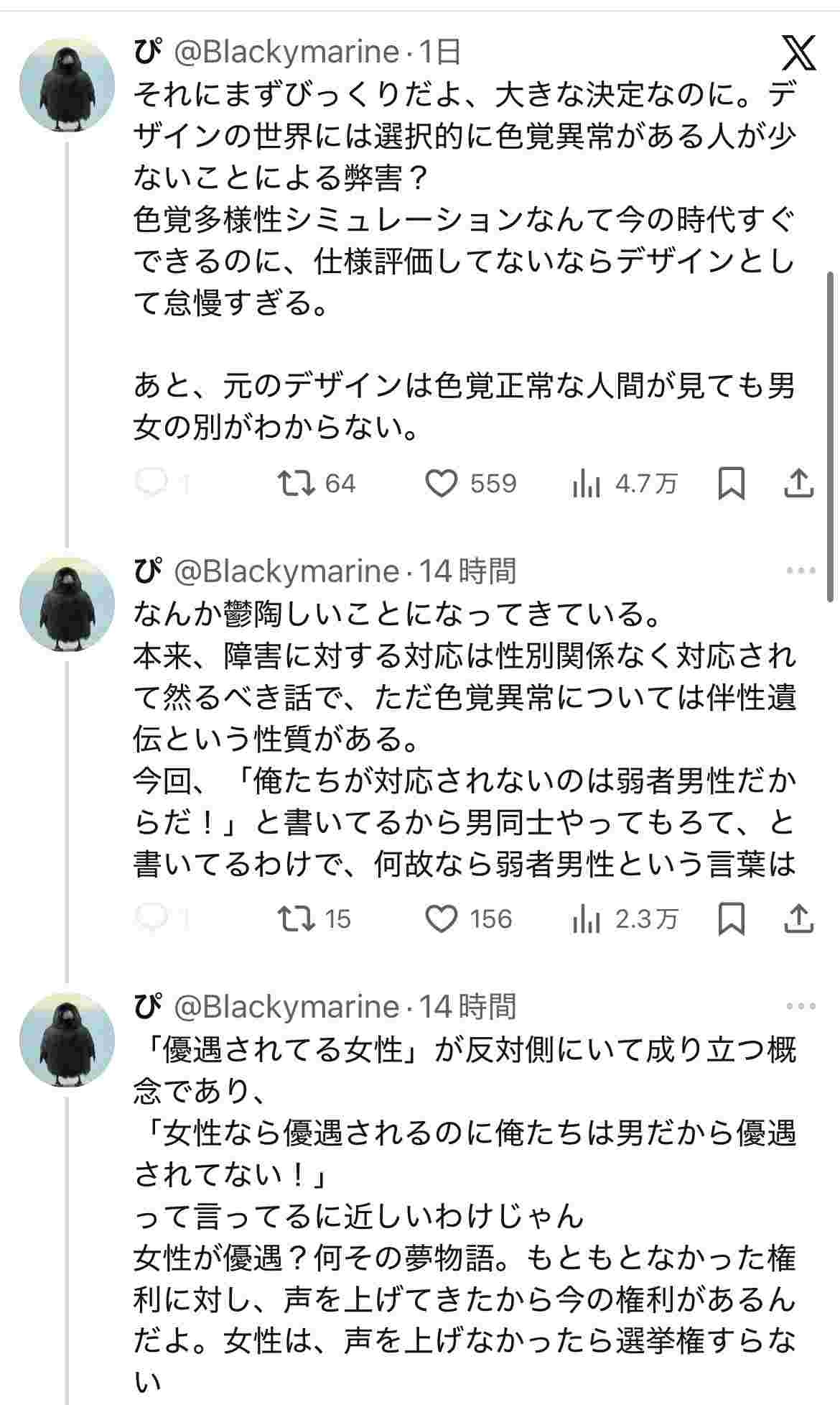 色弱への対応が行われないことにジェンダー出してもあんま意味ないって言ってるじゃん