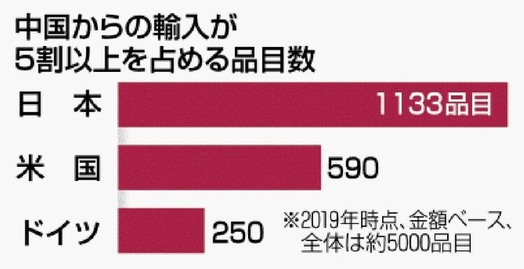 ・日本が中国に50%以上を依存している品目は1000超