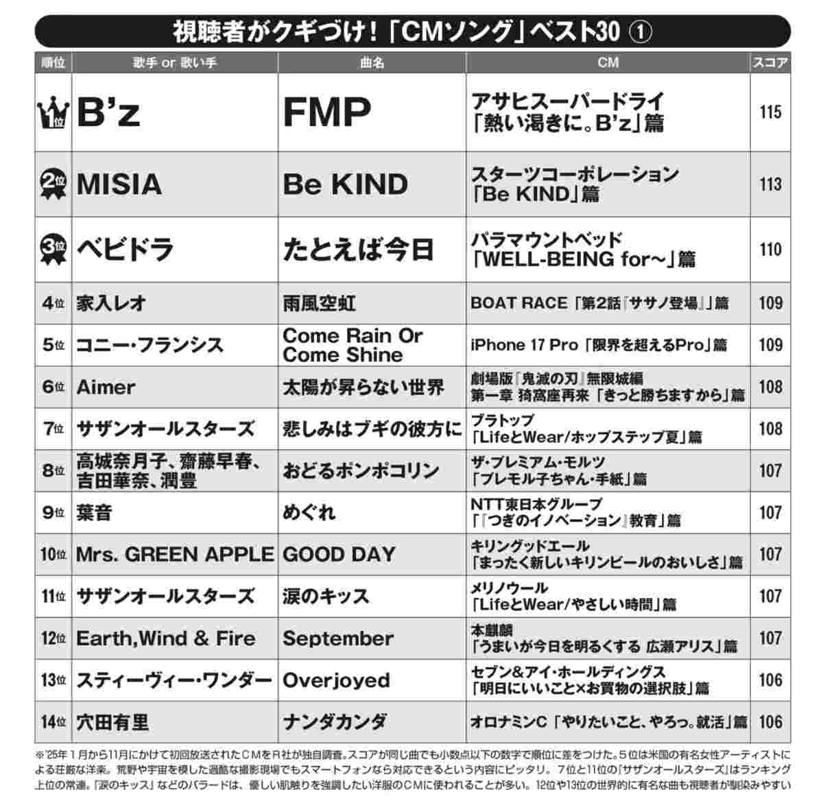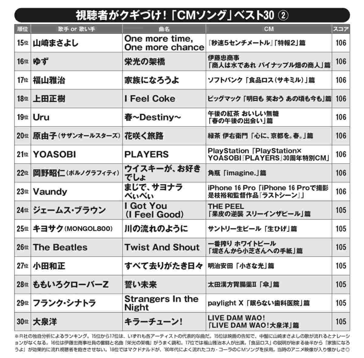 14位の『ナンダカンダ』もアレンジ曲です。オリジナルは藤井隆さん(53)が歌い、多くの人が聴き慣れています。CMでは、就職活動に向かう娘を応援するため、玄関先でノリノリの『ナンダカンダ』を歌う母親役の穴田有里さん(44)に思わず勇気づけられる。有名ソングのアレンジはクギづけ上位の鉄板です。