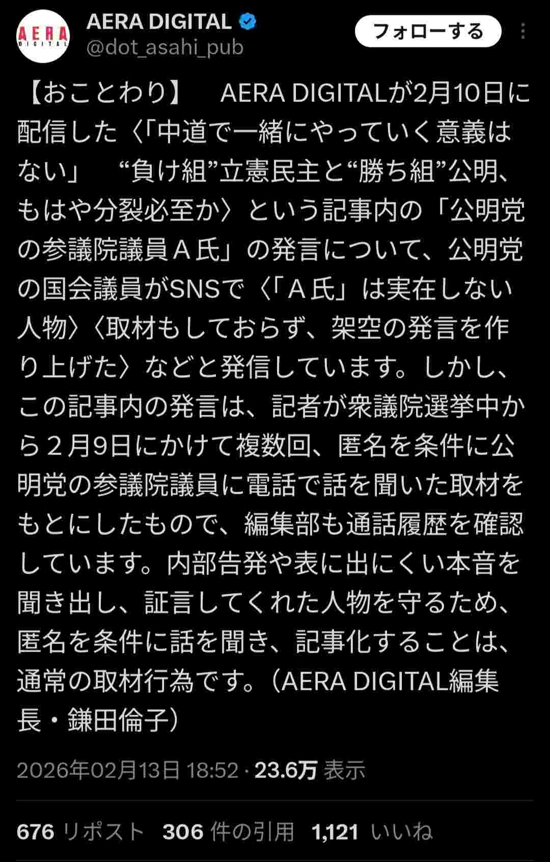 アエラ側には公表できるようなソースは何一つないってことなんよな