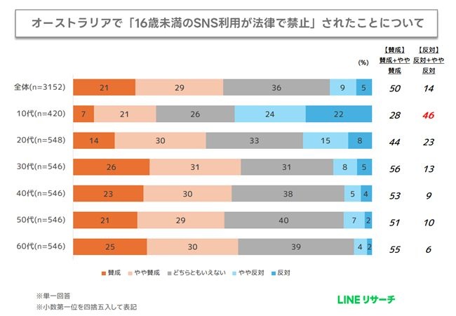 LINEヤフーが運営する「LINEリサーチ」は、オーストラリアで実施された「16歳未満のSNS利用禁止」の賛否に関する調査を実施した。15~69歳の男女3,152名が回答している。