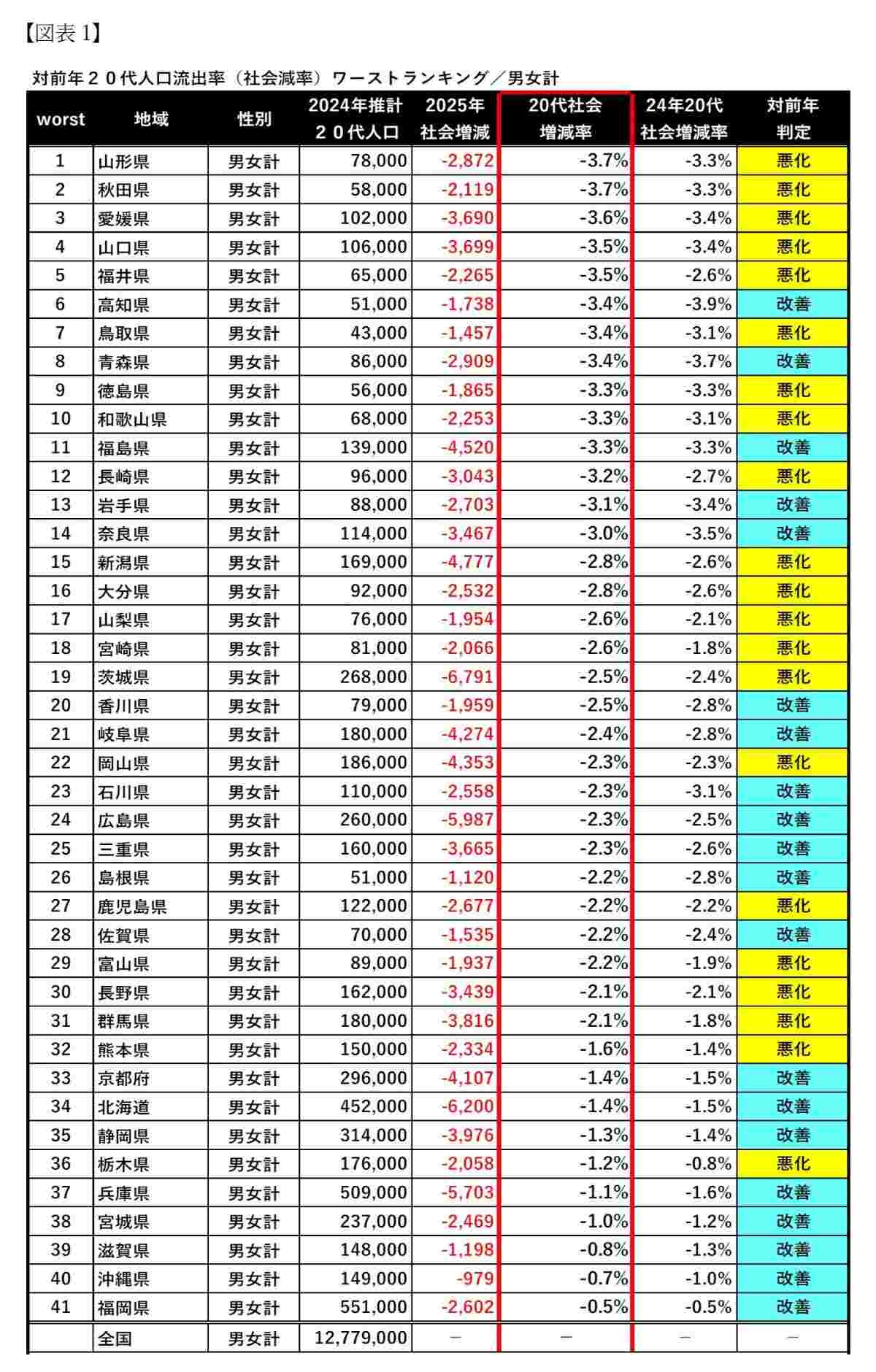 地元の人口サステナビリティに大きな影響力を持つ20代人口の流出について、本稿では対前年からの悪化・改善も含めて、男女計、男性、女性別に解説を行う。読者はあまりにもいびつな人口呼び寄せ構造が地方にあることに気がつくことだろう。