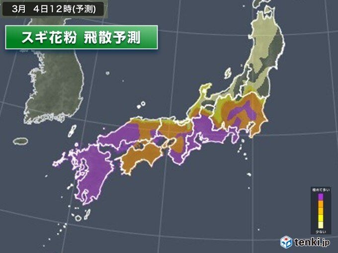 今日4日の花粉の飛散量は、関東~九州で「非常に多い」または「極めて多い」予想となっています。昨日3日から今朝(4日)にかけては雨の降った所が多いですが、今日4日の日中は各地とも天気が回復して、最高気温は平年並みか高い所が多くなりそうです。また、広い範囲で北よりの風が強まる見込みです。