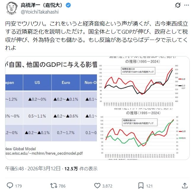高橋洋一「円安ウハウハ、これを言うと経済音痴と言われるが近隣窮乏化を説明しただけ、反論あるならデータで出せ」