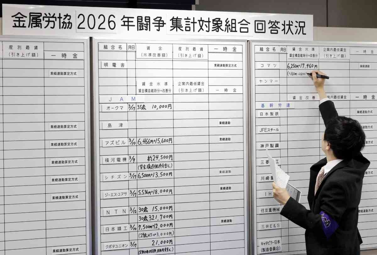 2026年春闘は18日、主要企業の集中回答日を迎え、三菱重工業や川崎重工業、三菱電機が基本給を底上げするベースアップ(ベア)相当分で労働組合の要求に満額回答した。物価高が長引く中、連合が目標とする全体賃上げ率5%の3年連続の確保に向け、大手企業は高水準の賃上げが相次いだ。中東情勢の緊迫化による原油価格の高騰などコスト負担の増大が見込まれており、中小企業の労使交渉に影を落としている。