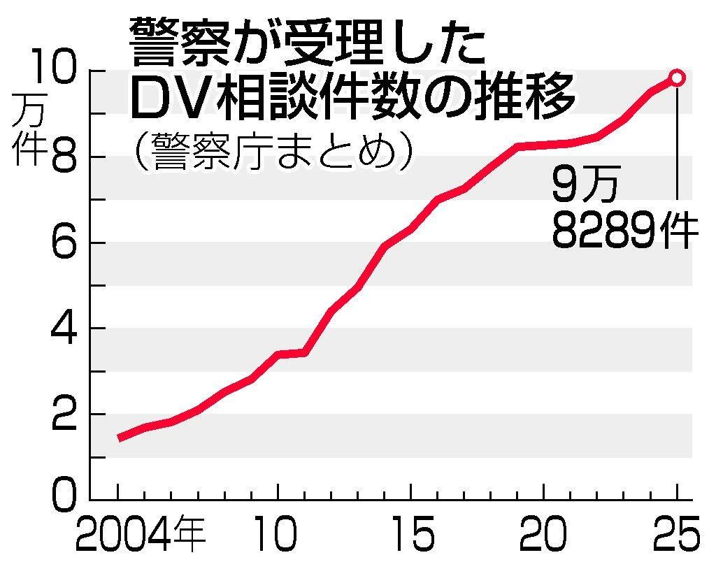 警察庁は19日、配偶者などからの暴力(DV)の相談件数が2025年に9万8289件あり、DV防止法が施行された01年以降で最多だったと発表した。