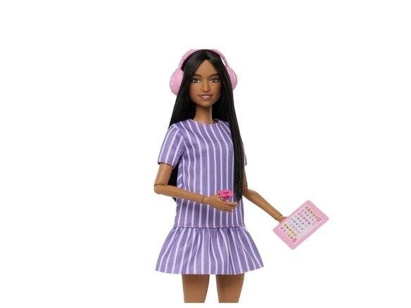 ノイズキャンセリングヘッドホンを装着した初の「自閉症バービー」。手元にはフィジェットスピナーと、意思疎通を助けるAACアプリを表示したタブレットを持つ