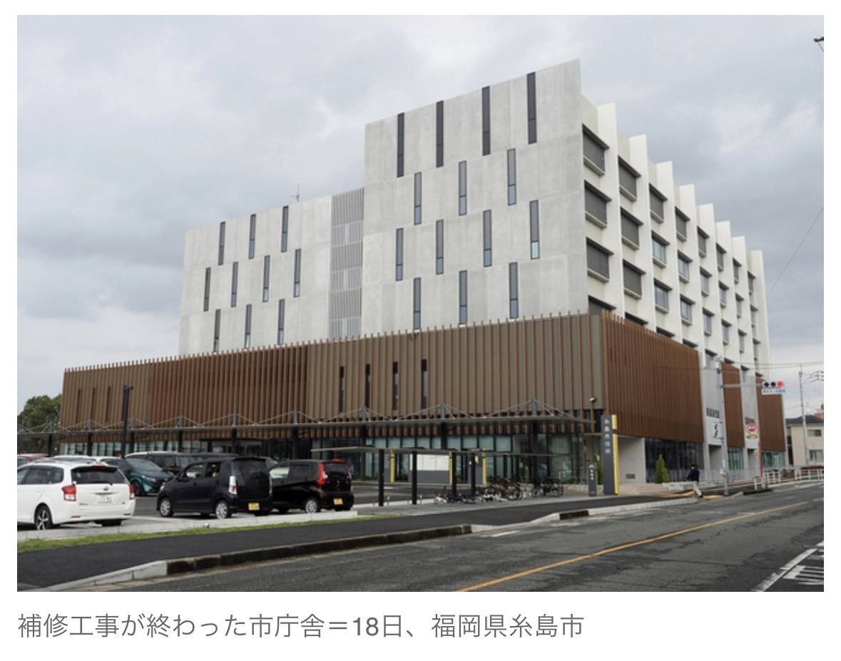 福岡県糸島市は18日、新築して2年足らずの市庁舎で、約250カ所に及ぶ外壁のひび割れや、4カ所の水漏れなどが確認されていたことを明らかにした。施工不良が原因で、元請け業者が約3千万円を負担し、既に補修を終えたという。同日の市議会一般質問で議員から「供用開始から間もない庁舎。小さな問題ではない」などとして原因究明を求める声が出た。