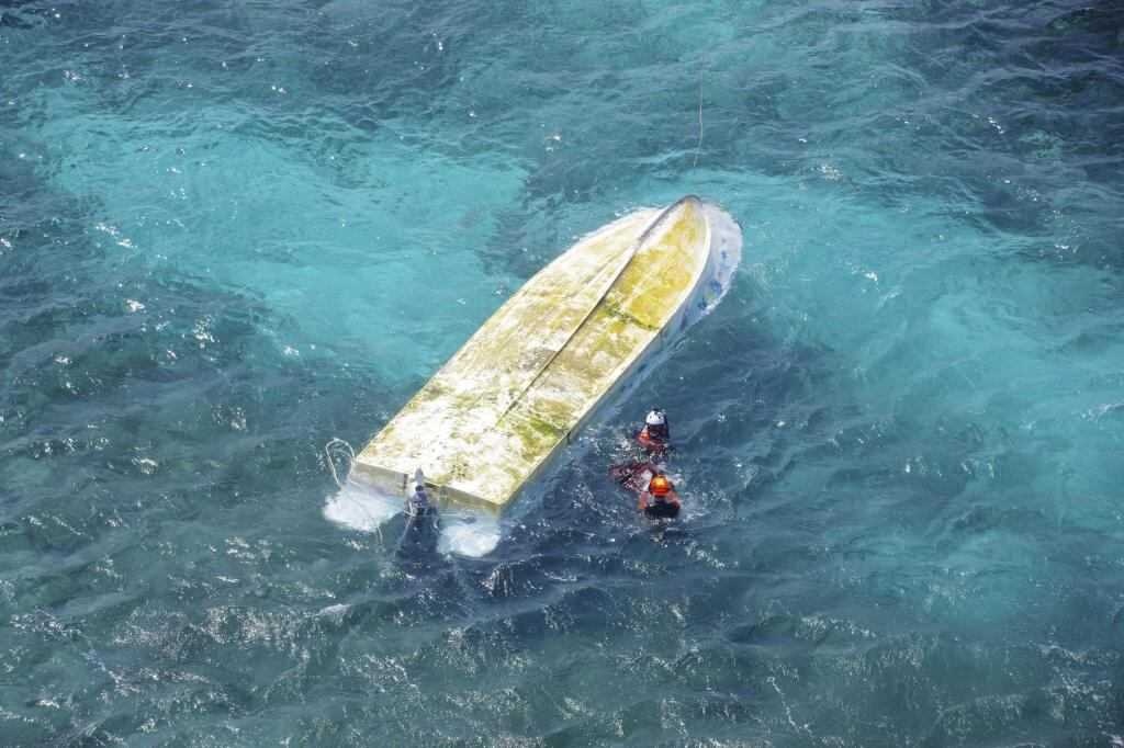 沖縄県名護市辺野古の沖合で転覆した船「平和丸」=3月16日午前11時59分(第11管区海上保安本部提供)