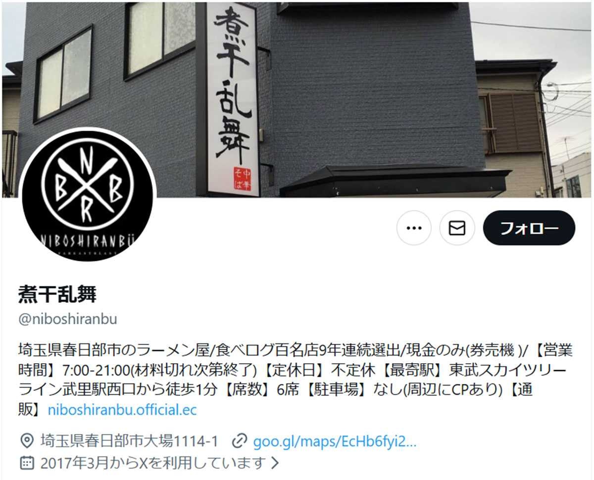 埼玉県春日部市のラーメン店「煮干乱舞」(公式Xより)