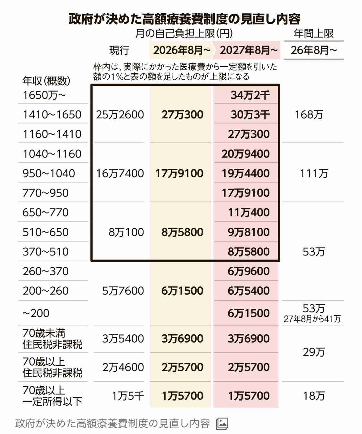 厚生労働省が検討を進める「高額療養費制度」の見直し案が判明した。所得に応じて2027年夏までに自己負担の月額上限を7~38%程度引き上げる。年収約650万~約770万円の人は、上限額の計算の基となる基準額が今の8万100円から11万400円になる。政府が実施を見送った昨年の案は13万8600円だったが、上げ幅を抑えた。