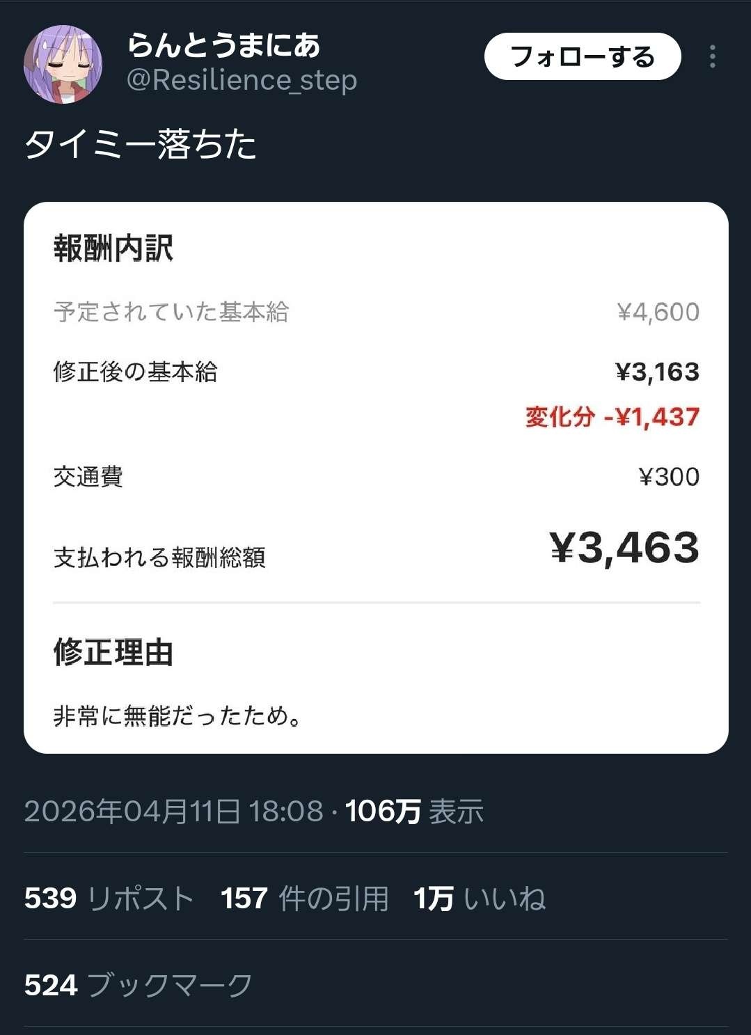 働かずに金もらえたパターンだからドヤ顔だろこれ、なおブラックリスト入り
