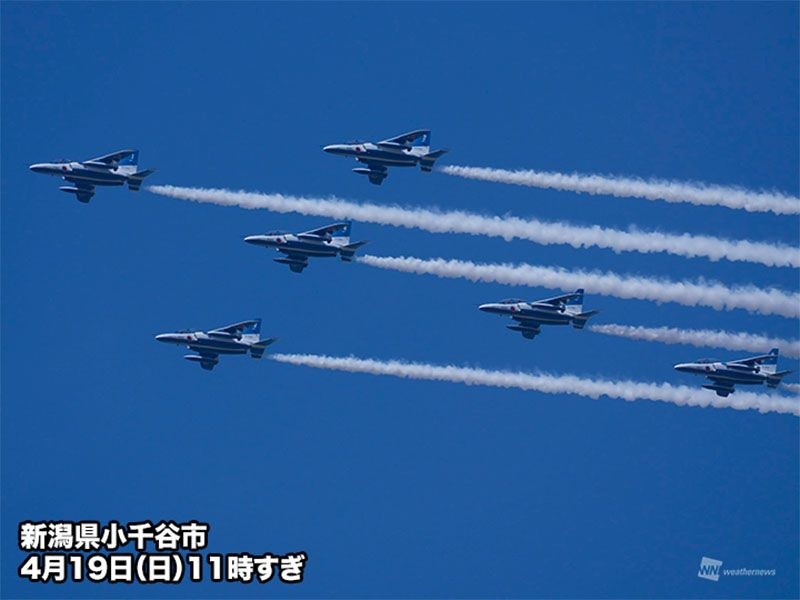 今日4月19日(日)は、平成16年に発生した中越大震災からの復興を果たした小千谷市で、「中越大震災復興記念祭」が開催されています。その中で、令和6年に台風の影響で中止になり、招致に再挑戦していた「ブルーインパルス展示飛行」が実施されました。 ウェザーニュースアプリにも、展示飛行の写真や動画のウェザーリポートがたくさん投...
