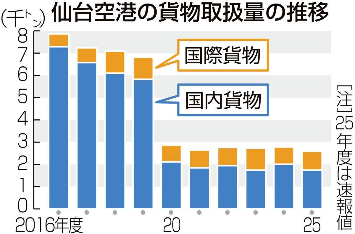 仙台空港の貨物取扱量がコロナ禍以降、低空飛行を続けている。2020~25年度は各年とも2000トン台で推移し、コロナ禍前(19年度)の約3~4割にとどまる。背景には航空機の小型化や大規模空港への集約化、貨物の積み込みの担い手不足など複合的で、浮上のきっかけが見えてこない。