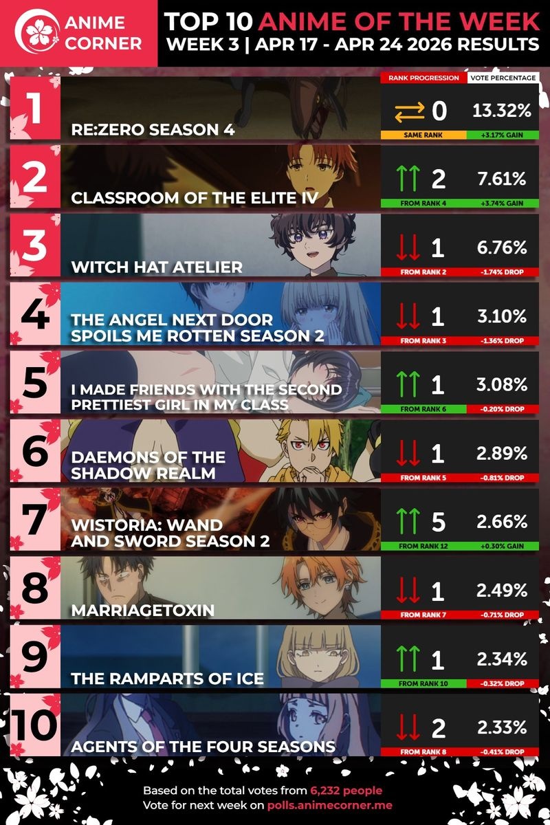 Re:ZERO シーズン4が3週連続でトップを維持し、その後ろにClassroom of the Elite IVとWitch Hat Atelierが続きます。