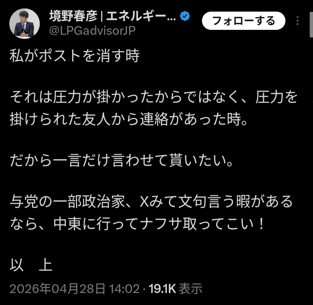 ツイートした本人に言えばいいのに、弱い立場のENEOSの社員に圧力掛ける政治家、ダセーよな