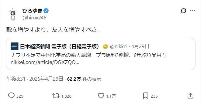 ひろゆき「敵を増やすより、友人を増やすべき。」ナフサ不足で中国化学品の輸入急増