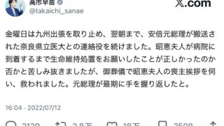 なんG高市早苗「安倍晋三氏は最期到着した昭恵夫人の手を握り返した」医者「即死でした」