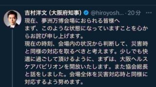 嫌儲吉村はん「万博会場から帰れなくて不安よな。大阪ヘルスケアパビリオン解放するから一泊してええで😤」